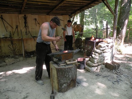 Les forgerons, en train de confectionner des fers à chevaux ;