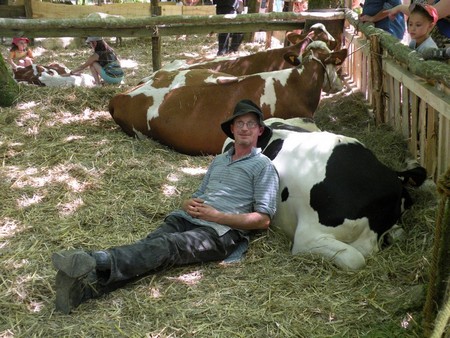Les boeufs Simmenthal (ils pèsent chacun 1150 kilos) et leur bouvier :