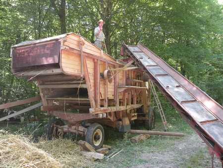 Nous sommes en juillet, les blés ont été moissonnés. La batteuse est en action :