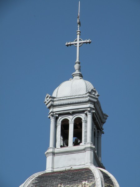 Le campanile où se trouve la sirène des pompiers, la croix et le coq